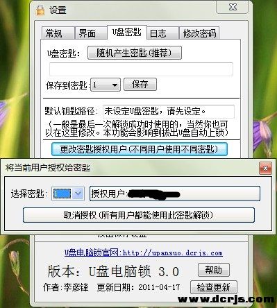 版本更新内容如下: 1.简化不同用户不同密匙解锁设置,傻瓜化操作,无需设置NTFS权限。 2.对锁屏界面程序进行优化,提高效率,大大增加了上锁解锁速度。 3.设置界面使用Tab选项卡的形式显示,保存设置统一归到一个“保存”按钮。 4.增加记录日志功能,可记录输错密码/正常解锁。支持摄像头拍照记录(此功能测试中)。 5.解锁密码于管理密码分开,可单独设置。 6.增加拔出U盘自动上锁功能(需要运行托盘程序) 7.支持锁屏界面背景,可设置图片。 8.修正检查更新模块在无法访问网络情况下出现错误声的BUG。 9.更改U盘密匙设置界面,选择密匙使用一个下来菜单选择。 10.锁屏界面版权信息全部显示在左下角,并且4秒后自动隐藏。 11.解锁后自动检查更新。 12.增加解锁时自动选择U盘密匙功能(系统自动选择一个可解锁的密匙,无需手动选择,这样就可以完美地插入U盘自动解锁了)。 13.修正了启动设置程序时,检查更新完毕后跑焦点的BUG。 14.增加了安全性,锁屏时对系统做了更多的限制。 15.修正了其它若干BUG,优化了若干细节,此处不一一列举。 16.密码错误次数设为0时,将显示密码被禁用,而不是显示错误0次。 17.增加屏保上锁功能,支持屏保后自动上锁,详细设置方法见帮助文档。 18.开机自动启动使用注册表方式,如果之前设置过开机自动启动的朋友请自行删除“开始-程序-启动”中的快捷方式。